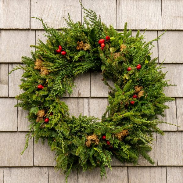 Small Fancy Wreath – measures approximately 20-22″. Greenery varies depending on what we’re able to forage that week. Add a bow for free if you’d like. Best if hung outdoors.
